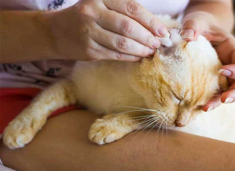 - Dùng khăn mềm thấm nước ấm lau nhẹ nhàng bên ngoài tai mèo.